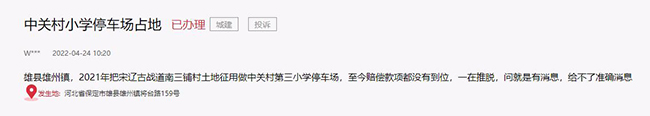 人民網雄安6月1日電 (劉師豪)“因建設小學公共停車場征用了村內部分土地,但賠償款項還沒到位!苯衲4月,有村民向人民網“領導留言板”留言,稱自己應得的征地補償還未下發,希望政府能提供幫助。
