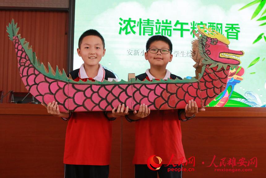 安新小學的學生展示自己制作的龍舟。人民網 劉師豪攝