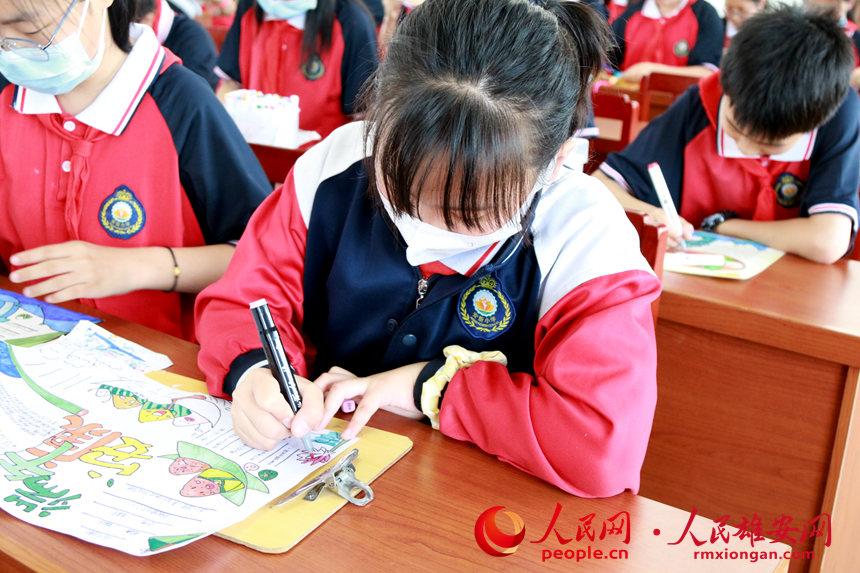 安新小學的學生正在繪制端午節主題手抄報。人民網 劉師豪攝
