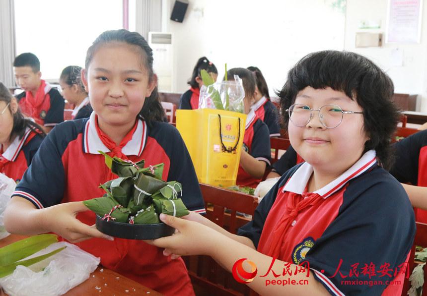 兩名學生展示自己包的粽子。人民網 劉師豪攝