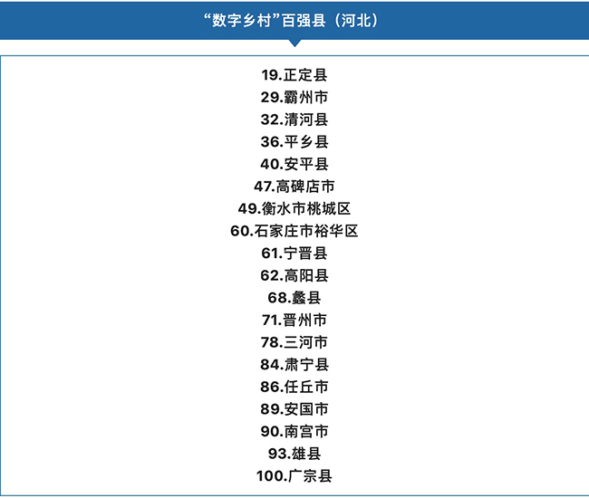 3、北京大學新農村發展研究院聯合阿里研究院舉辦《縣域數字鄉村指數報告》發布會,公布全國數字鄉村百強縣榜單,河北19個區縣上榜,數量排名全國第二。其中,雄安雄縣上榜。