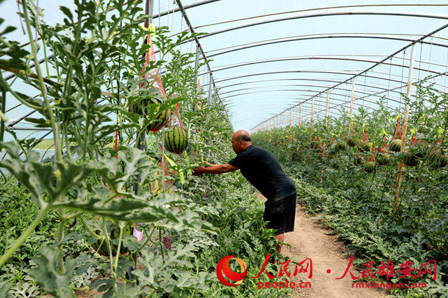 王法月在瓜棚內查看西瓜長勢。人民網 劉師豪攝