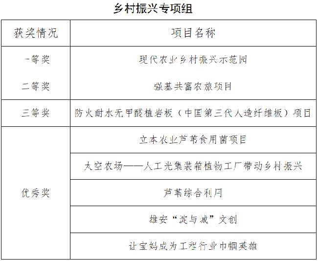 決賽主體賽和專項賽各項目組分別評選出一等獎1名,二等獎1名, 三等獎1名,優秀獎5名。獲獎項目將被授予“雄安新區優秀創業創新項目”稱號,并在積分落戶、創業擔保貸款申請等方面獲得政策支持。