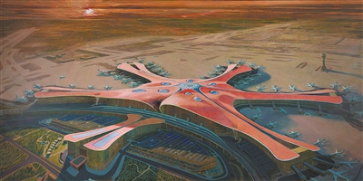 有的美術工作者在追求歷史真實與藝術真實相統一中,展現大型基礎設施帶來的人享其行、物暢其流的美好生活。例如,王沂光油畫《新機場》和沙永匯版畫《鳳凰展翅》,皆聚焦北京大興國際機場。前者充分發揮油彩特有的細膩美感,以俯視的視角,全景式展現大興機場的雄姿。晨光下,曲線流暢、科技感十足的航站樓靜靜矗立于廣闊的大地上,遠處地平線與天際線交匯處旭日東升,使畫面更顯宏闊、意境更顯深遠。后者藝術地刻畫了大興機場如鳳凰展翅、騰飛天際的壯麗畫面,并著意表現了機場內現代化、藝術化的先進設施和繁忙的運輸場景,讓作品敘事更真實、內涵更豐厚。兩幅作品通過個案描繪,展現了我國綜合交通樞紐及集疏運體系建設的穩步推進。