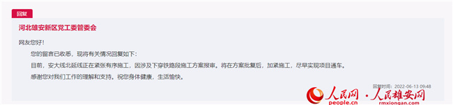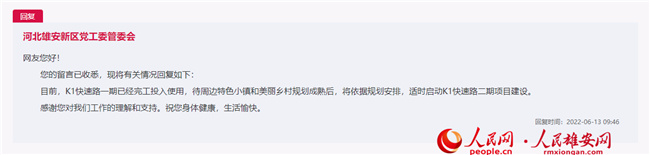 收到留言后,雄安新區黨工委管委會回應稱:目前,安大線北延線正在緊張有序施工,因涉及下穿鐵路段施工方案報審,將在方案批復后加緊施工,盡早實現項目通車;K1快速路一期目前已經完工投入使用,待周邊特色小鎮和美麗鄉村規劃成熟后,將依據規劃安排,適時啟動K1快速路二期項目建設。
