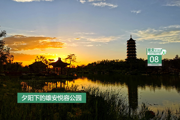 今天是2022年7月8日,星期五,天氣晴轉多云,25℃~39℃。在封面和大家見面的是夕陽下的雄安悅容公園。