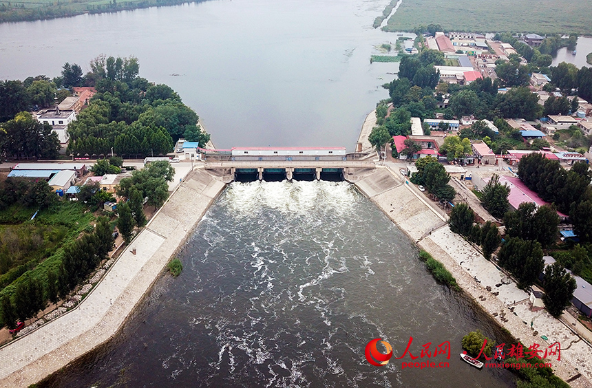 圖為趙王新河治理工程(雄縣段)上游正在泄水的棗林莊樞紐4孔閘。人民網?宋燁文攝