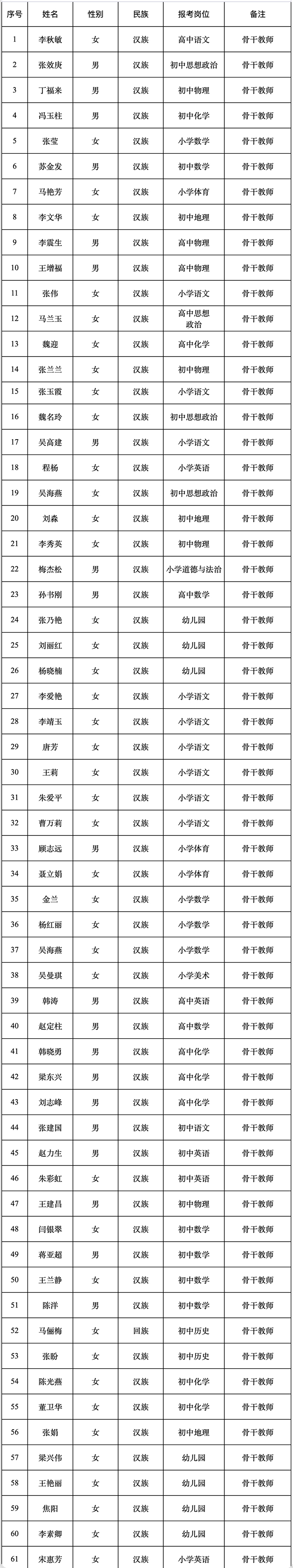 根據河北雄安新區新建片區面向全國公開選聘骨干教師工作安排,經報名、簡歷篩選、面試、體檢和考察等環節,擬聘李秋敏等61名同志到雄安新區新建片區學校工作,現予以公示。