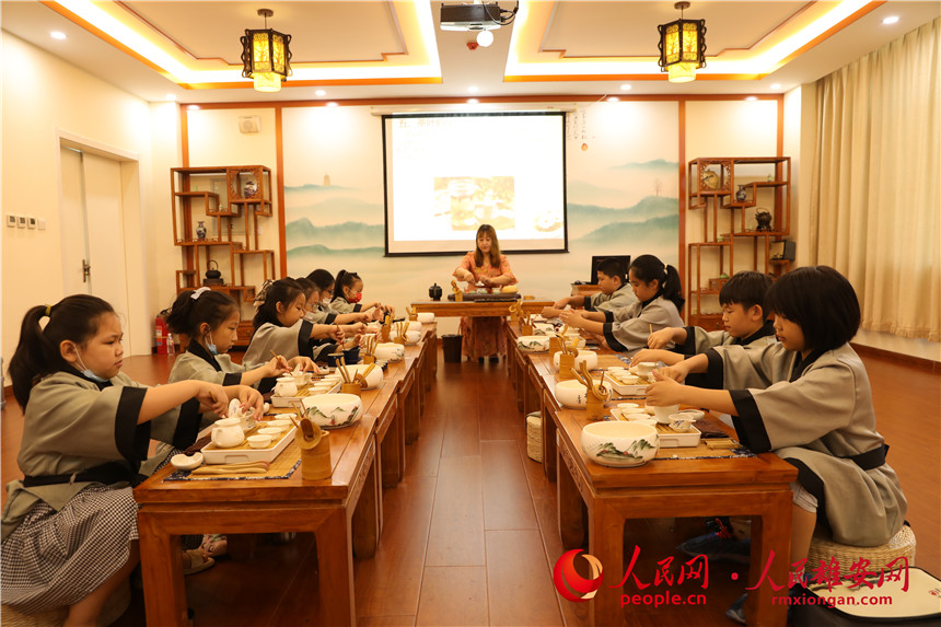 容城縣青少年活動中心內,孩子們在上茶藝課。人民網 王紅攝