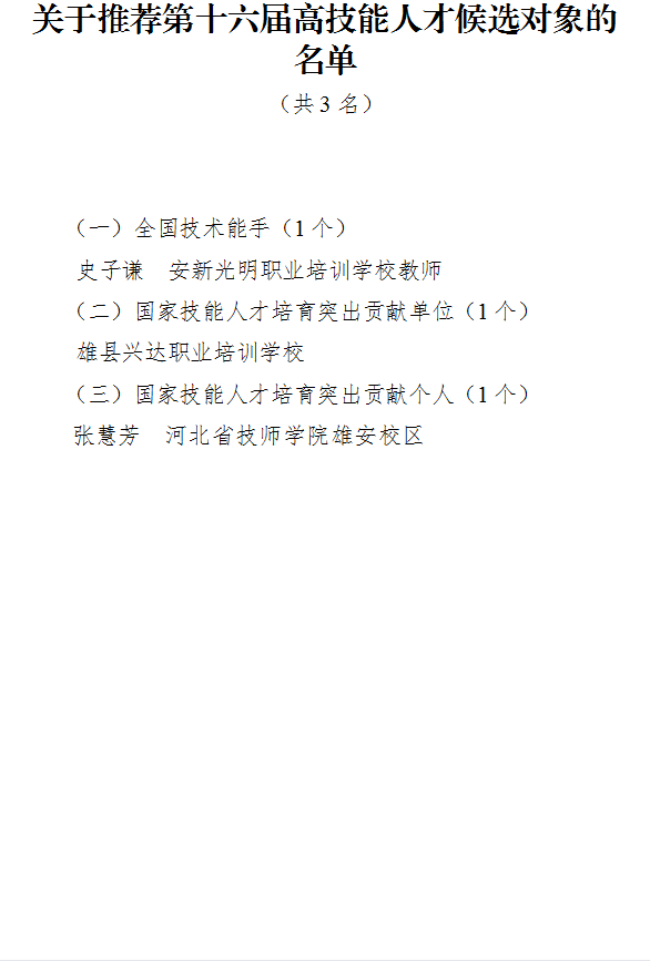 根據《關于做好第十六屆高技能人才評選活動的通知》的要求,經自主申報、縣級推薦、專家評審,擬推薦史子謙為全國技術能手獎項候選人、張慧芳為國家技能人才培育突出貢獻個人獎項候選人、雄縣興達職業培訓學校為國家技能人才培育突出貢獻單位,現予以公示。公示期為2022年7月26日至8月1日。
