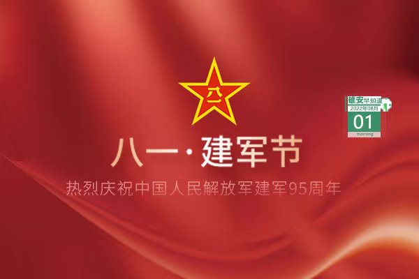 今天是2022年8月1日,星期一,天氣晴,26℃~34℃。今天是八一建軍節,正值中國人民解放軍建軍95周年,讓我們向中國軍人致敬!