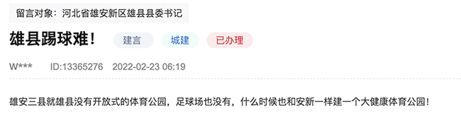 收到留言后,雄縣縣委回復,稱“我縣正在建設雙侯體育公園,設有1500平米足球場一塊,標準籃球場兩塊,乒乓球、健身設施等?!?/p>