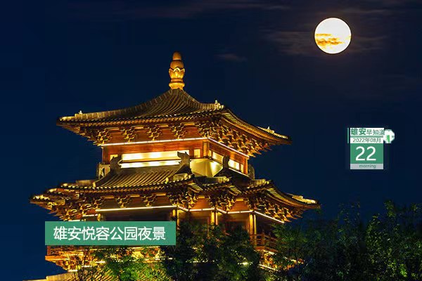 今天是2022年8月22日,星期一,天氣多云,19℃~30℃。在封面和大家見面的是雄安悅容公園夜景。