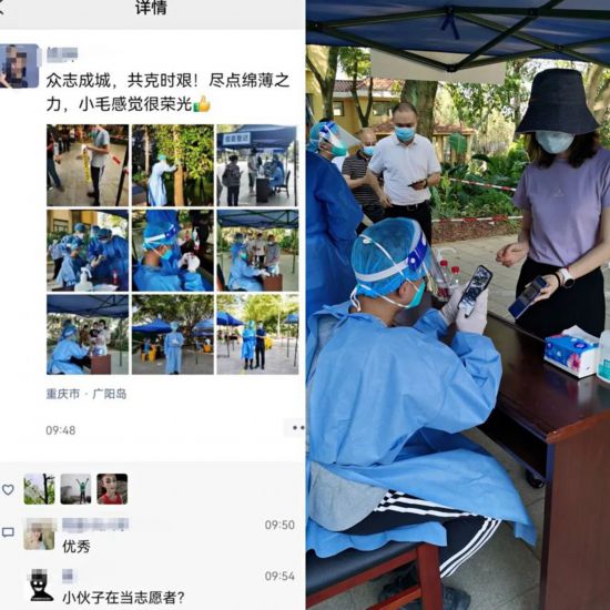 重慶一中高一學子秦子喬主動申請在渝州路街道核酸采集點擔任志愿者。就在家門口,服務了自己親人、發小、鄰居的這個大男孩說:“??吹缴鐓^工作者堅持在抗疫一線,這么熱,穿著防護服,非常辛苦。還沒開學,我有時間,那就加入,一起服務大家”。