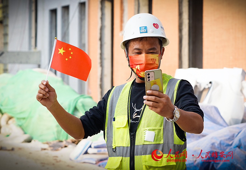 雄安建設者正揮動國旗,與遠在異地的家人視頻通話。人民網 宋燁文攝