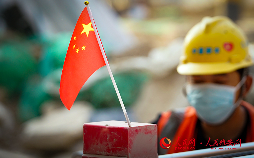 雄安金湖未來城項目工地上飄揚“中國紅”。人民網 宋燁文攝
