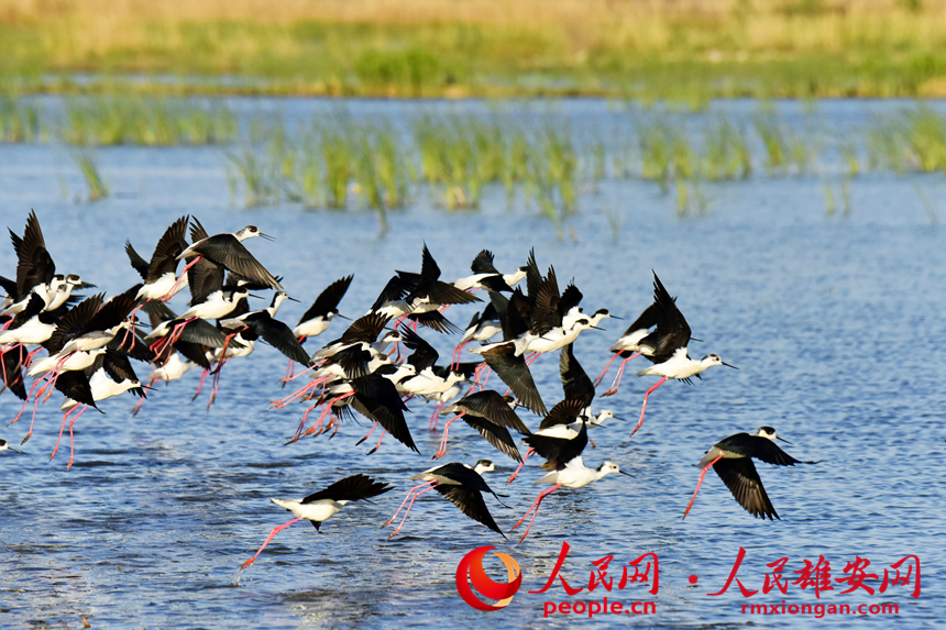 棲息在白洋淀一處水域內的黑翅長腳鷸。周龍山攝