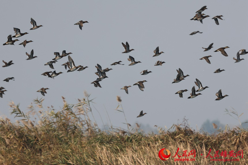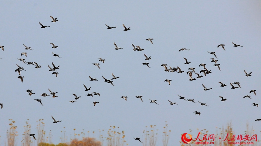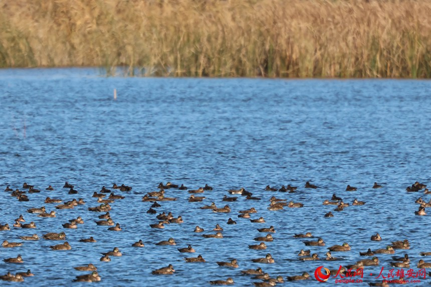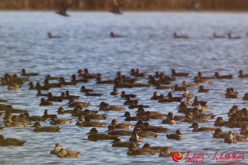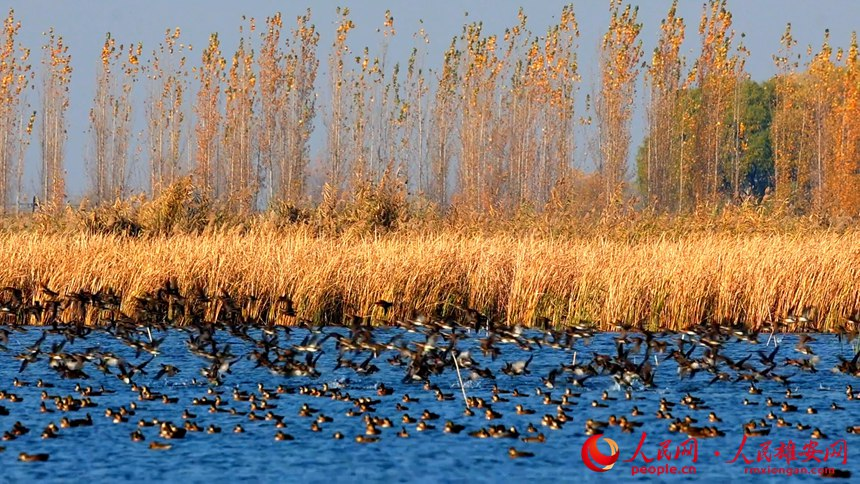人民網雄安11月23日電 初冬的白洋淀,蘆葦金黃,碧波蕩漾。淀面上,數千只野鴨棲息游弋,伴隨聲響,千鳥競飛,場面壯觀。