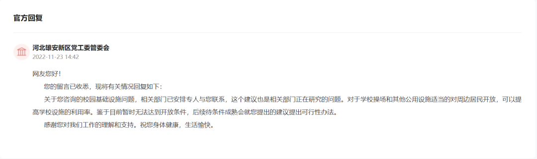 8、有網友日前在人民網“領導留言板”留言,希望能夠在不影響學校正常運行和安全的前提下,適度開放校內部分閑置公共資源,增加學?;A設施利用率。收到留言后,雄安新區黨工委管委會作了回復。