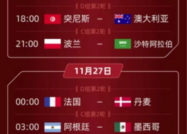 卡塔爾世界杯今日18:00將迎來D組第2輪突尼斯對陣澳大利亞的比賽,21:00將迎來C組第2輪波蘭對陣沙特阿拉伯的比賽;27日00:00將迎來D組第2輪法國對陣丹麥,03:00將迎來C組第2輪阿根廷對陣墨西哥的比賽。
