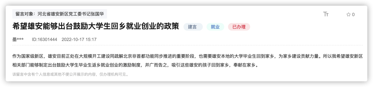 人民網雄安11月27日電?(宋燁文、施云娟)大學畢業后,想回雄安新區創業就業怎么辦?網友“墨****”在人民網“領導留言板”留言,“希望雄安能夠出臺鼓勵大學生回鄉就業創業的政策”,吸引雄安本地大學生回到家鄉,為家鄉做出奉獻。