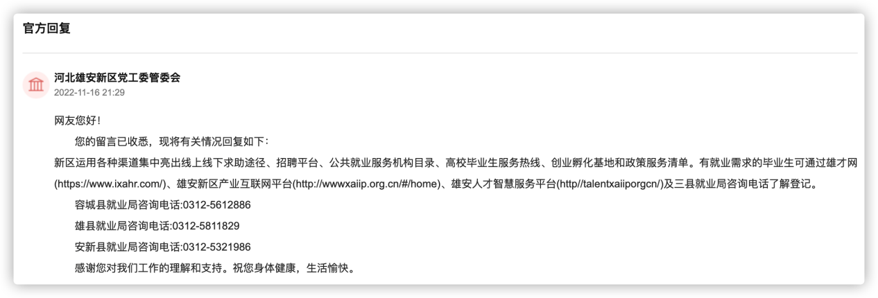 雄安新區黨工委管委會收到留言后表示,新區運用各種渠道集中亮出線上線下求助途徑、招聘平臺、公共就業服務機構目錄、高校畢業生服務熱線、創業孵化基地和政策服務清單。有就業需求的畢業生可通過雄才網(https://www.ixahr.com/)、雄安新區產業互聯網平臺(http://wwwxaiip.org.cn/#/home)、雄安人才智慧服務平臺(http//talentxaiiporgcn/)及三縣就業局咨詢電話了解登記。