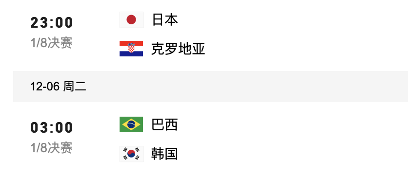 卡塔爾世界杯今日23:00將迎來1/8決賽日本對陣克羅地亞的比賽;12月6日03:00將迎來1/8決賽巴西對陣韓國的比賽。