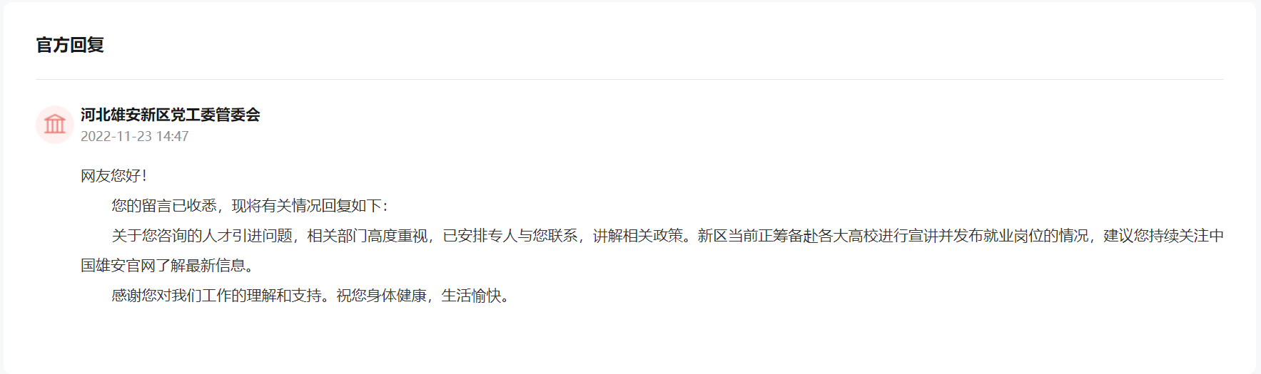 4、近期,有多位網友在人民網“領導留言板”留言,稱愿意來雄安新區干事創業,想了解新區相關政策、舉措。對于這些留言,雄安新區黨工委管委會作出回復。