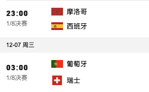 4、卡塔爾世界杯今日23:00將迎來1/8決賽摩洛哥對陣西班牙的比賽;12月7日03:00將迎來1/8決賽葡萄牙對陣瑞士的比賽。