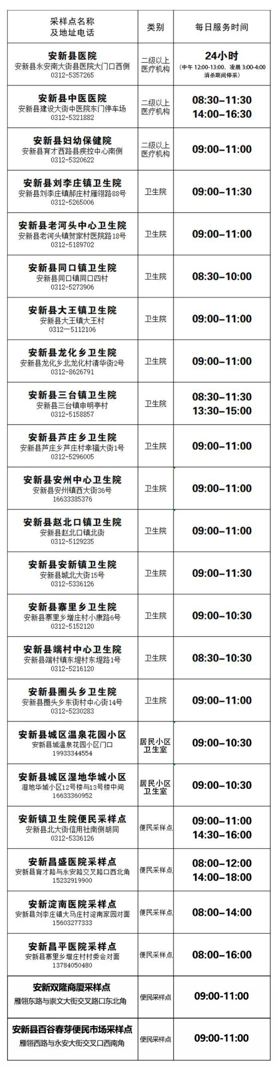 8、方便廣大群眾核酸檢測需求,人民雄安網整理了截至4日,容城縣和安新縣最新公布的核酸采樣點信息,以便有檢測需求的居民就近采樣。