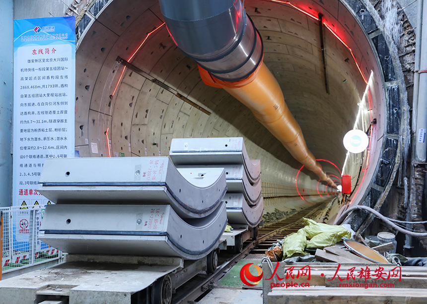 雄安新區至北京大興國際機場快線建設現場預制管片正運輸進區間隧道。人民網?李兆民攝
