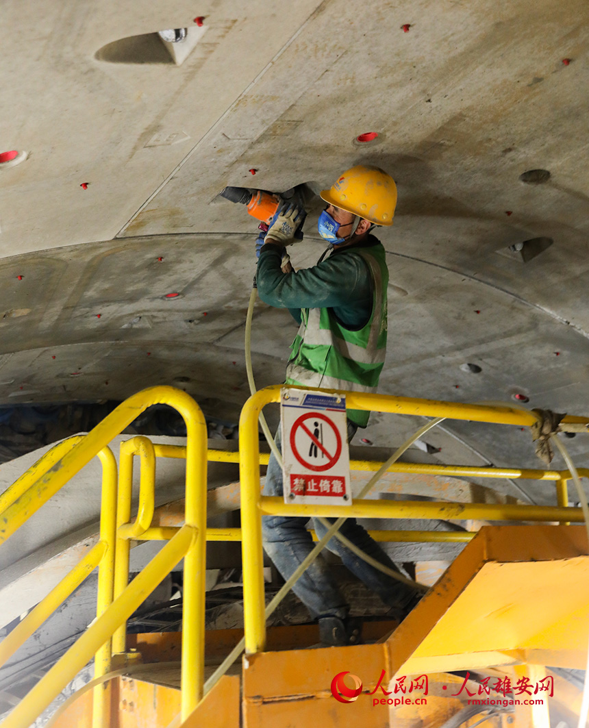 雄安新區至北京大興國際機場快線建設現場工人師傅正在安裝預制管片。人民網?李兆民攝