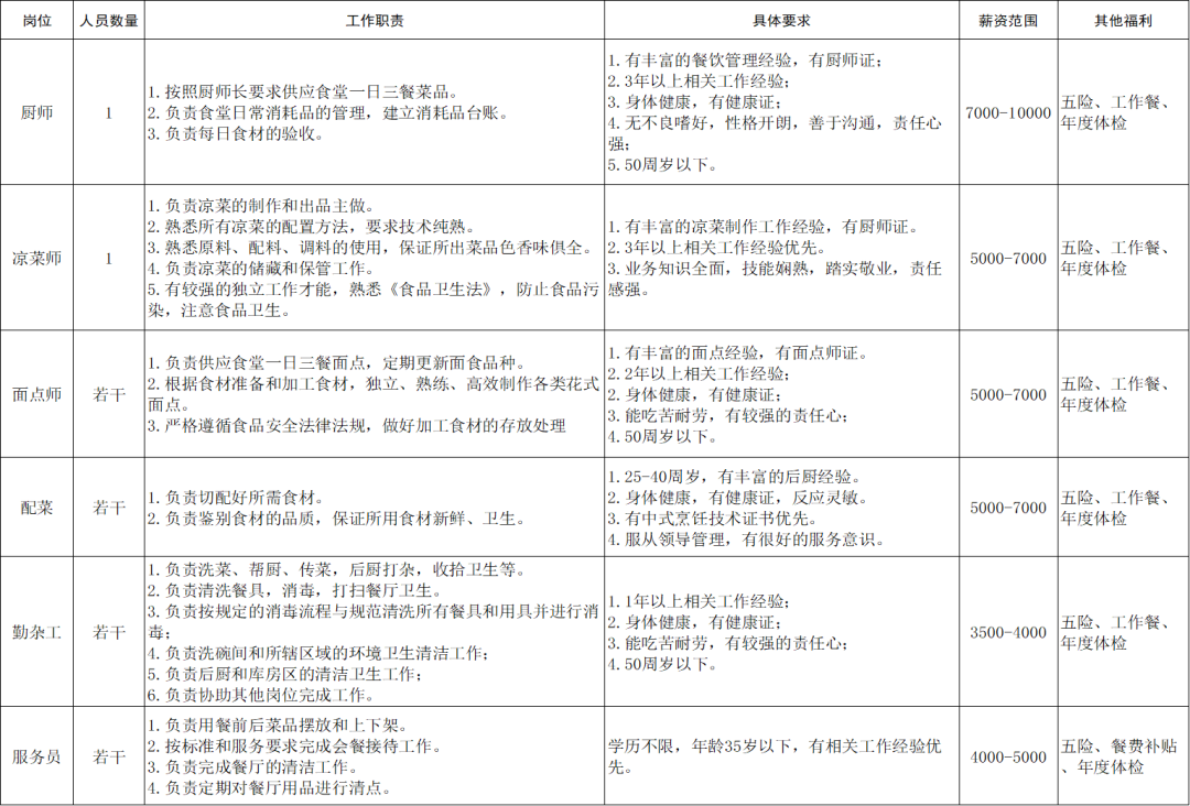 河北雄安人力資源服務有限公司(以下簡稱雄安人力公司)根據工作需要,現面向社會公開招聘職工餐廳服務業務外包員工。工作地點在雄安新區容東片區,從事廚師、涼菜制作、后廚切配、面點、勤雜等相關工作。