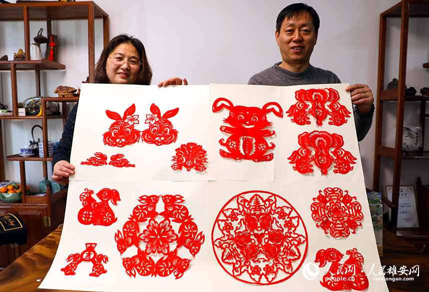 王愛和愛人一起展示已完成的“兔紙”。人民網?宋燁文攝