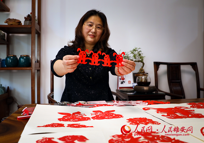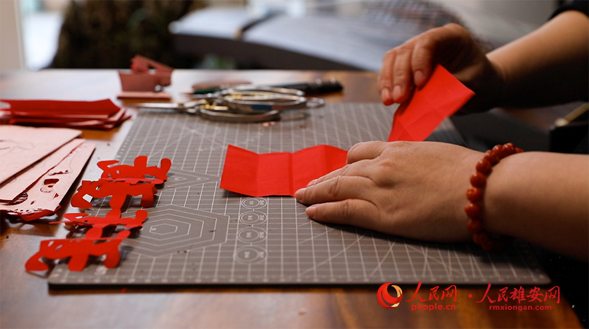 人民網雄安1月19日電?(宋燁文)1張紅紙、2把剪刀、3寸桌墊,一開一合不出3分鐘,一串“團結兔”便在王愛的手下誕生。紅紅火火的“團結兔”可愛又喜慶,洋溢著濃濃年味兒。