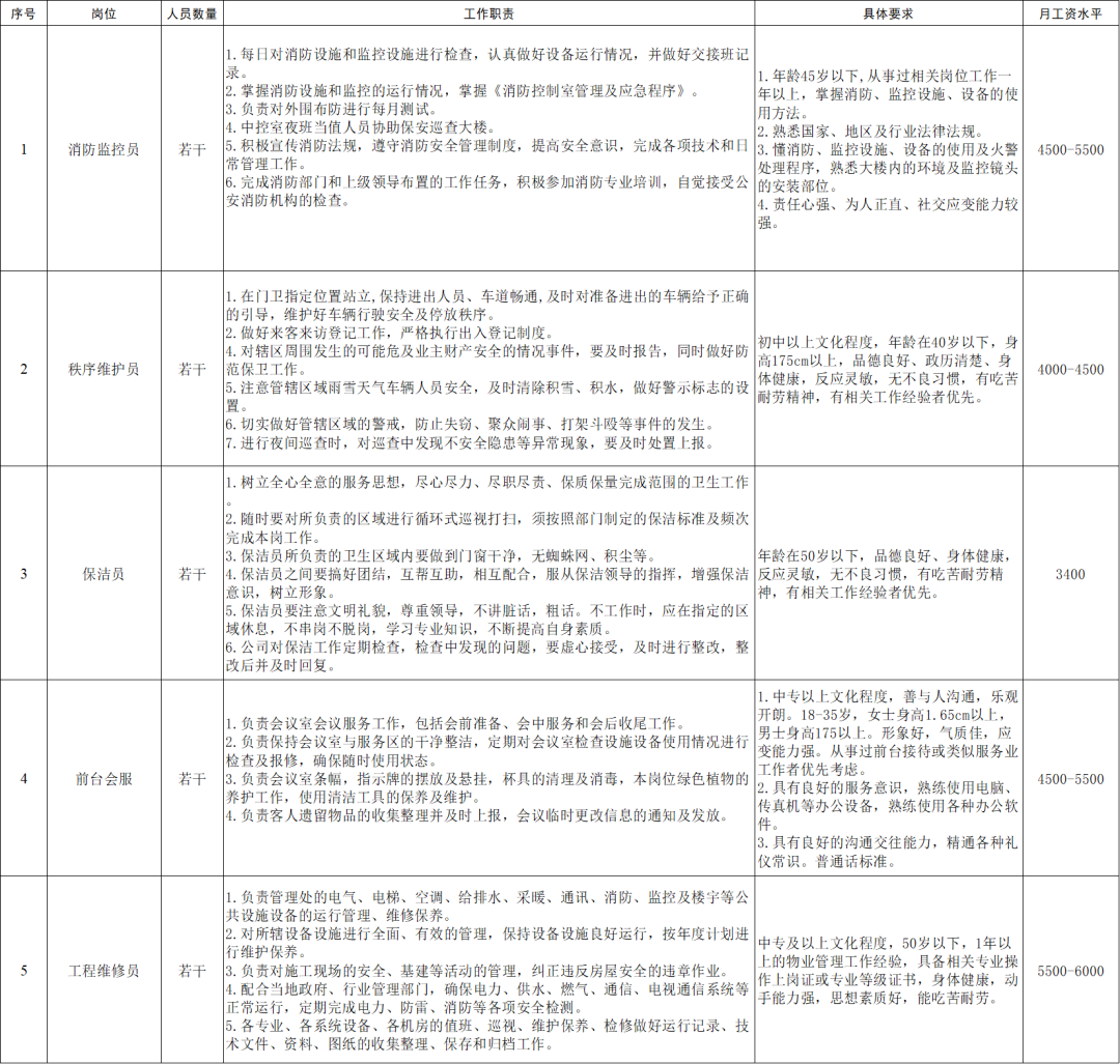 人民網雄安1月31日電 (何美萱)雄安人力公司現面向社會公開招聘物業服務人員若干,工作地點在容東片區,主要從事秩序維護、保潔、工程維修、前臺會服等物業服務相關工作。