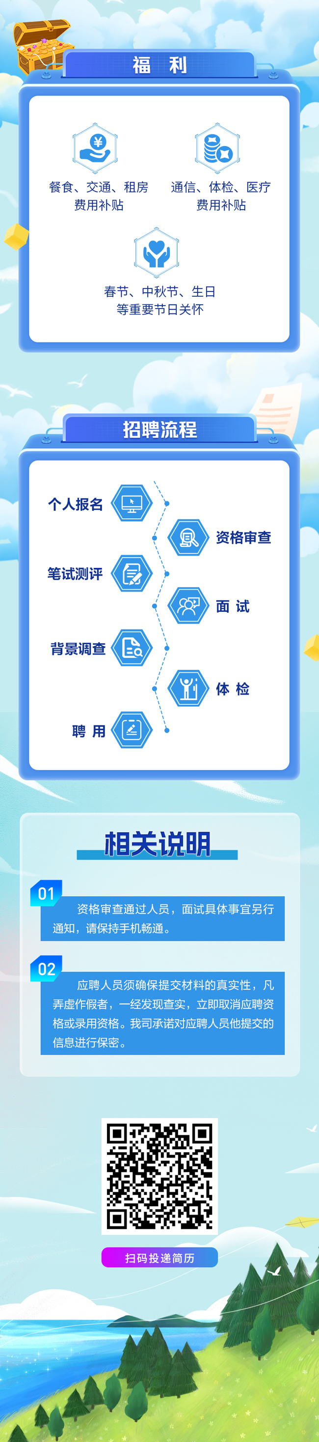 此次招聘要求應聘者年齡需不超過35歲,本科及以上學歷即可報名,入職后可享受餐食、交通、租房費用補貼,通信、體檢、醫療費用補貼以及重要節日關懷等多種福利,有意者可掃描以下二維碼進行報名。