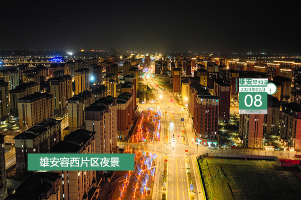 今天是2023年2月8日,星期三,多云轉陰,-5℃~8℃。在封面和大家見面的是雄安容西片區夜景。
