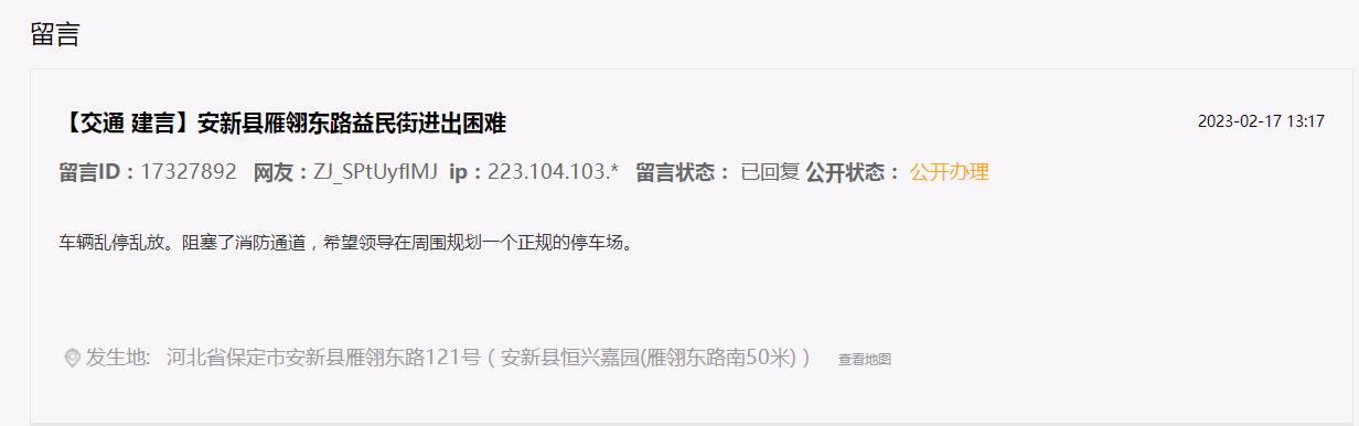 人民網雄安3月2日電 (何美萱)“安新縣雁翎東路益民街進出困難,車輛亂停亂放。阻塞了消防通道,希望領導在周圍規劃一個正規的停車場?!比涨?,有網友在人民網“領導留言板”留言稱,希望在益民街周圍規劃一個正規的停車場。