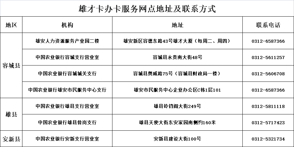 雄安新區黨工委人才辦服務熱線:0312-5568311、0312-5568305,雄才卡辦卡服務熱線:0312-6587366。