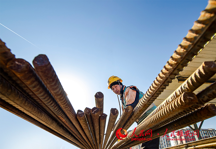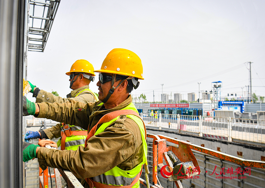 在雄安新區至北京大興國際機場快線(R1線)項目五標段一分部建設現場,工人正在進行施工作業。人民網?宋燁文攝
