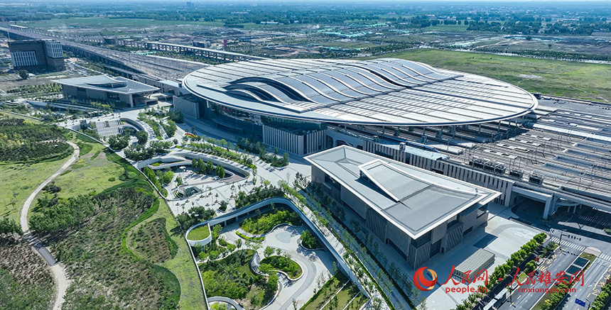雄安高鐵站,從空中俯瞰,形似“青蓮滴露”,鑲嵌在雄安新區昝崗片區。人民網記者 李兆民攝