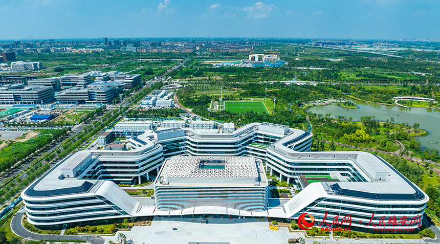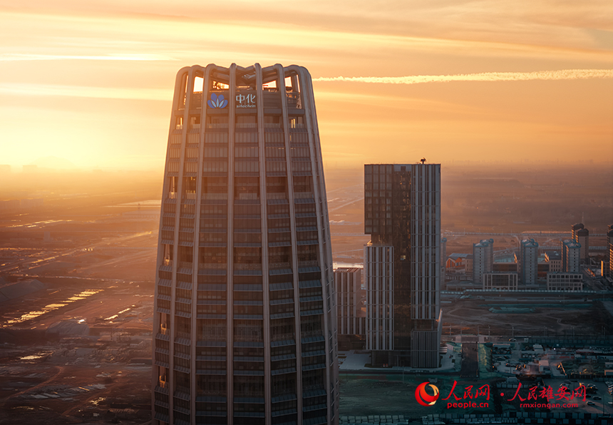 中國星網以四瓣之花為形,中心玉琮狀建筑承衛星之韻,周邊飄帶環繞,繪就城市綠軸新畫卷,映照“花綻雄安,星耀華夏”。人民網記者 李兆民攝