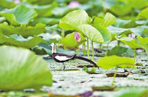 截至目前,白洋淀野生鳥類增加至296種。圖為7月7日拍攝的水雉在白洋淀棲息覓食。 本報記者 劉光昱攝