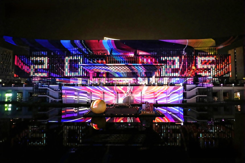 假期內,雄安商務服務中心尋環XLOOP每晚上演的巨幕建筑Mapping光影秀。雄安集團供圖
