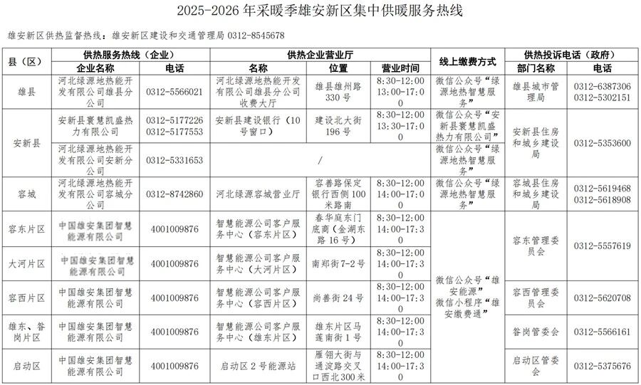 4、雄安新區集中供暖服務及監督熱線公布。